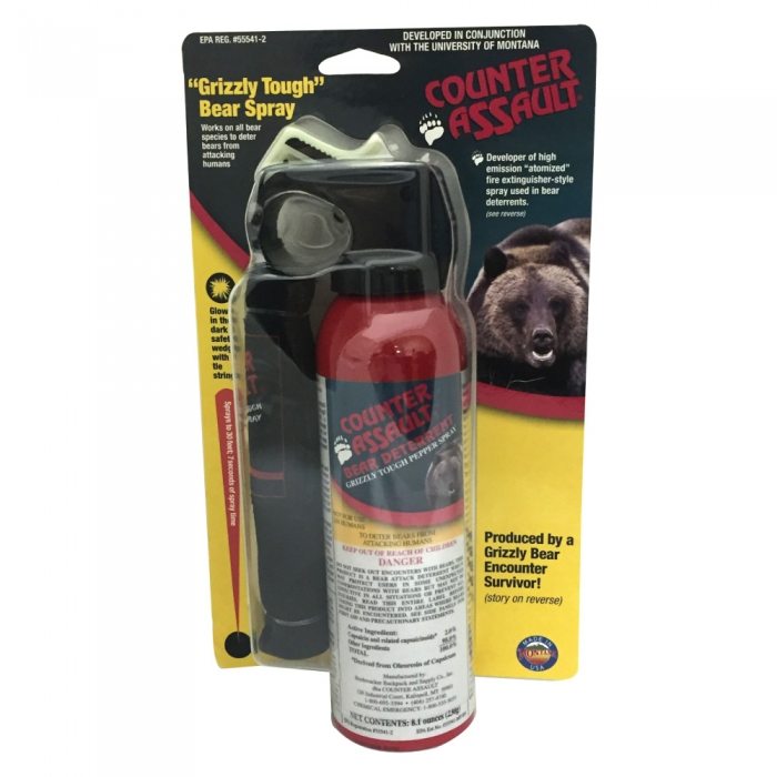 Counter Assault Bear Deterrent spray is made to drive bears away in the event of an attack. It’s a non-lethal method of defense against aggressive or curious bears. Made from a derivative of Capsicum, a red pepper oil that effects the upper respiratory system, it triggers involuntary eye closure and intense burning. Comes with holster and 8.1 ounce, 30 foot spray with 7 seconds of spray duration. Easy and quick to use. Studies show that bear spray is the #1 defense weapon against bears.